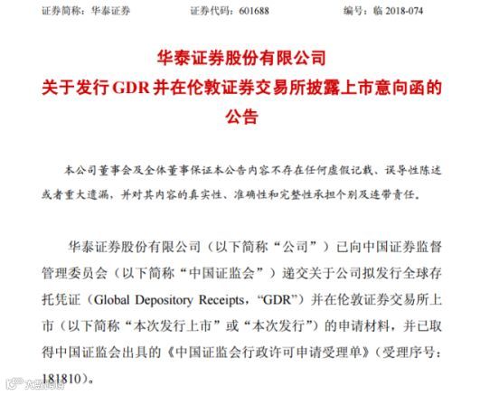 华泰证券昨晚公告称,公司已对证监会递交关于拟发行全球存托凭证(Global Depository Receipts,GDR”)并在伦敦证券交易所上市的申请材料,已取证监会的正式受理。