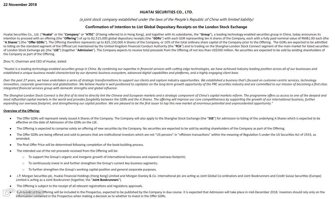 同时,华泰证券也于昨日(11月22日)在伦敦证券交易所披露上市意向函,对发行项目、公司状况、未来展望等信息做了披露。