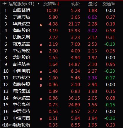 油价的下跌直接利好交通运输行业,特别是航空运输板块,截至收盘,山西路桥涨停,宁波海运涨幅近6%,华夏航空涨4.08%,南方航空涨逾2%,东方航空、中国国航、吉祥航空等涨幅超1%。