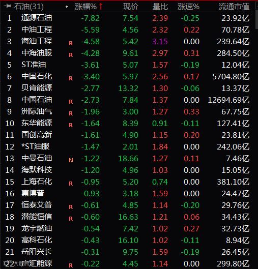 截至收盘,石油板块位居两市行业板块跌幅首位。个股方面,通源石油下跌逾7%,中油工程、海油工程、中海油服跌幅超过4%,中国石化跌逾3%,中国石油跌幅近3%。