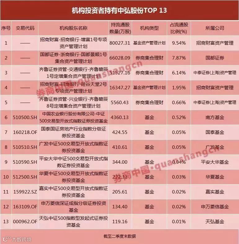 2014年,申万菱信基金、海通证券、宝盈基金、财通基金、东海基金、招商财富资管、申万菱信资管和中泰资管8家机构参与中弘股份定向增发,如今6家机构已经悉数退出,但仍有2家机构还未完全退出,分别是齐鲁证券资管-交通银行-齐鲁碧辰1号定增集合资产管理计划和招商财富-招商银行-硅谷天堂2号专项资产管理计划,暂居中弘股份第4大股东和第5大股东。