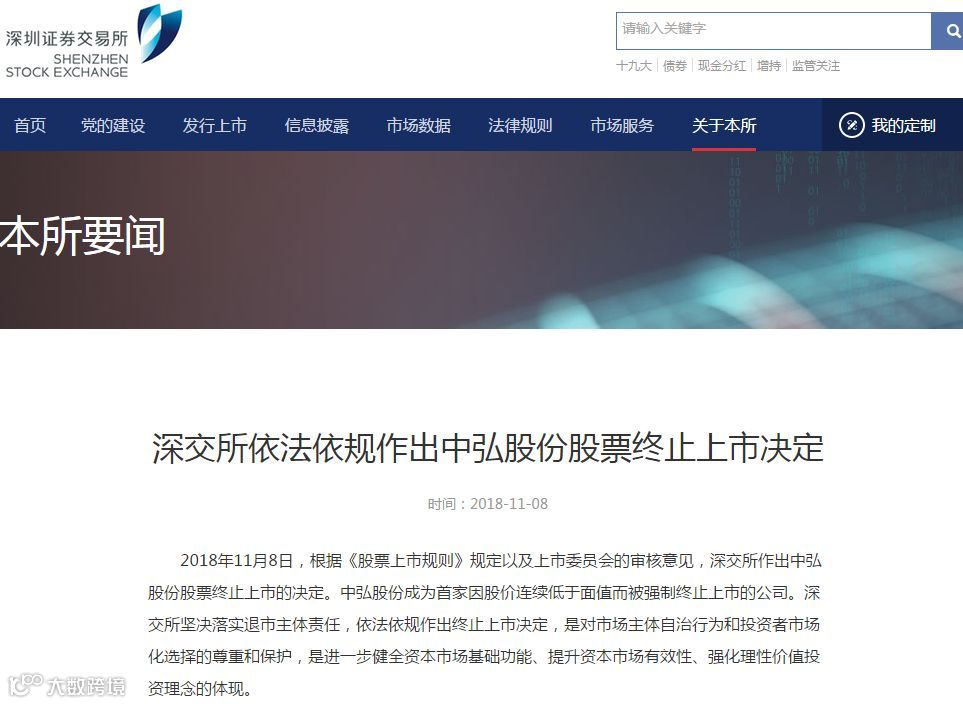 2018年11月8日,深交所作出中弘股份股票终止上市的决定。