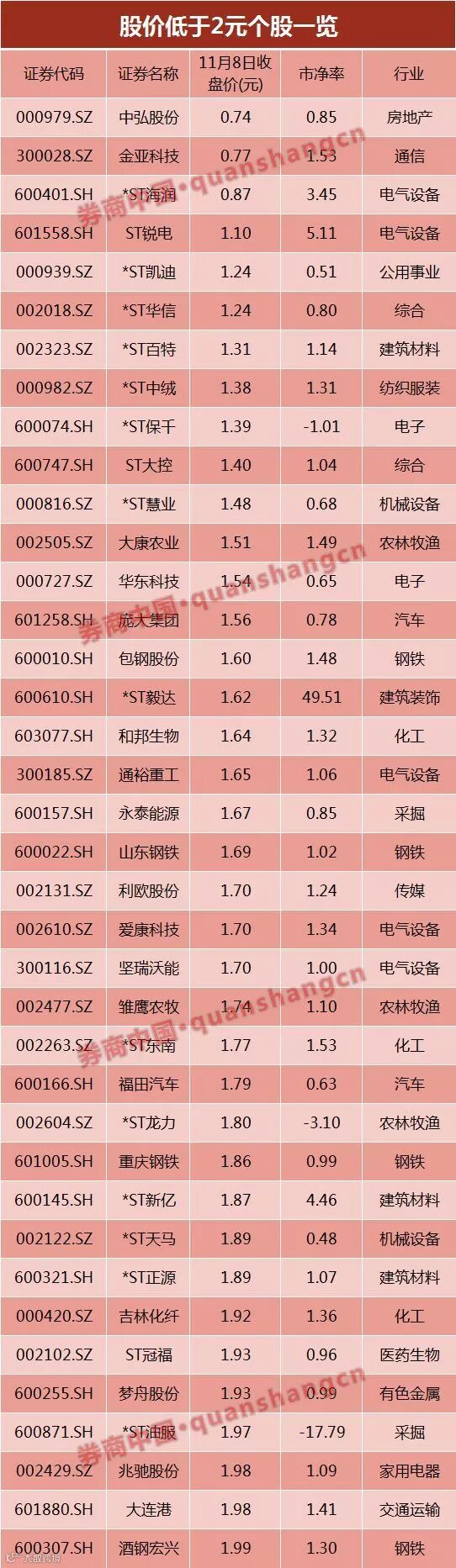 此外,随着A股行情持续下挫,低价股阵营也不在不断壮大,股价在1元-2元的“准仙股”共有35只,其中16只为ST股,例如ST锐电、*ST凯迪、*ST华信、*ST百特、*ST中绒等等。