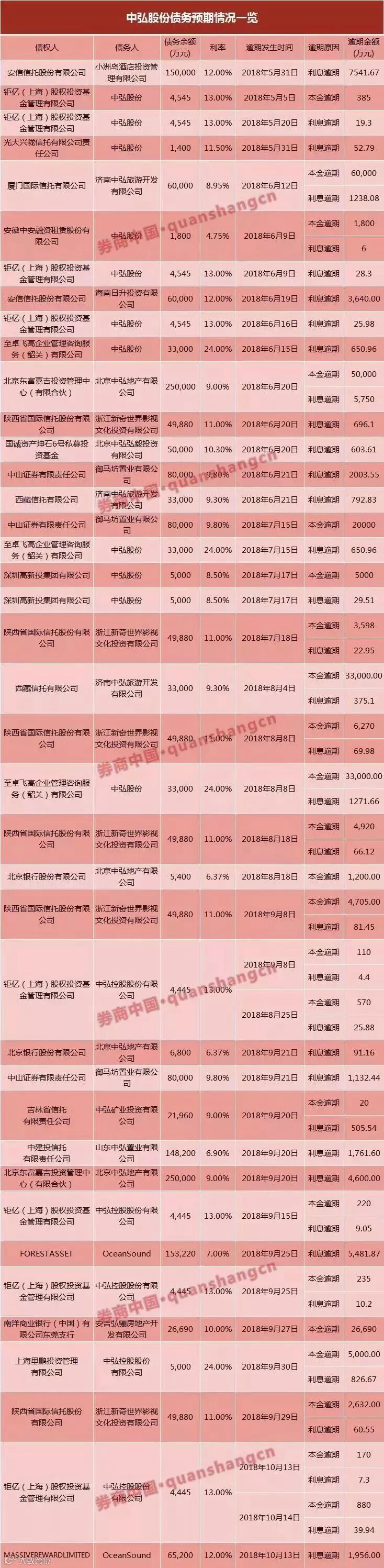 截至2018年10月29日,中弘股份及下属控股子公司累计逾期债务本息合计金额为78.16亿元,涉及银行、券商、信托等多家金融机构。