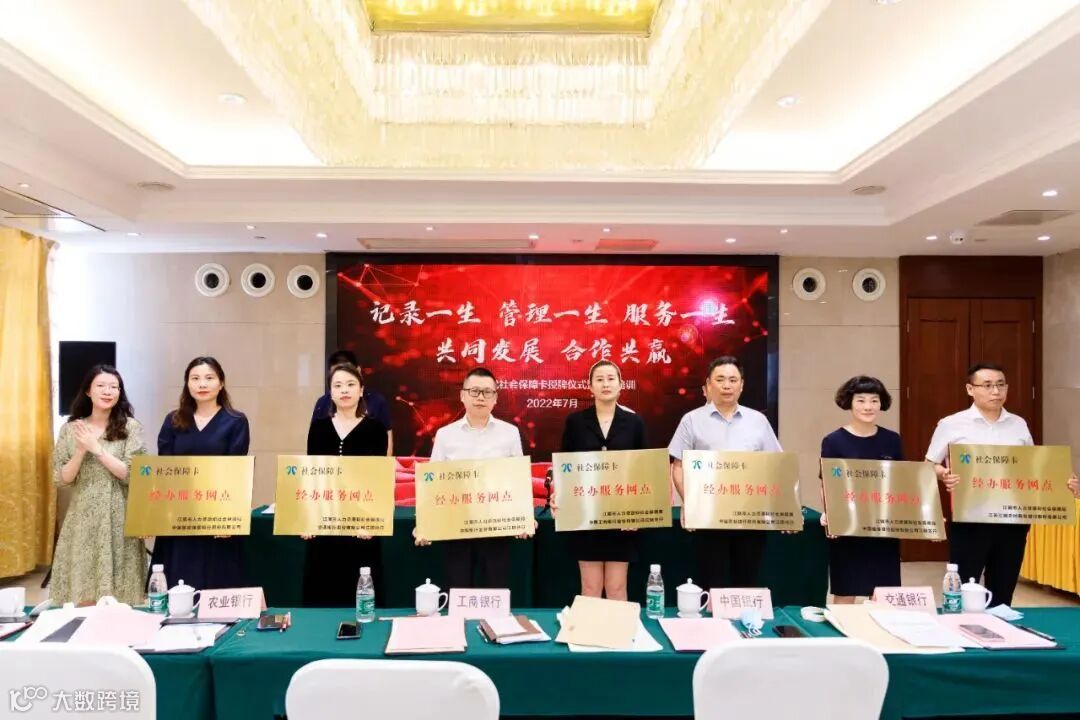 2022年7月28日上午,江阴市人社局开展第三代社会保障卡授牌仪式。无锡市人社局综服中心主任朱旭东、综服中心社保卡管理部副部长朱庆烨,江阴市人社局副局长居琳,江阴农商银行社会保障卡分管领导、业务主管等人参加了活动。