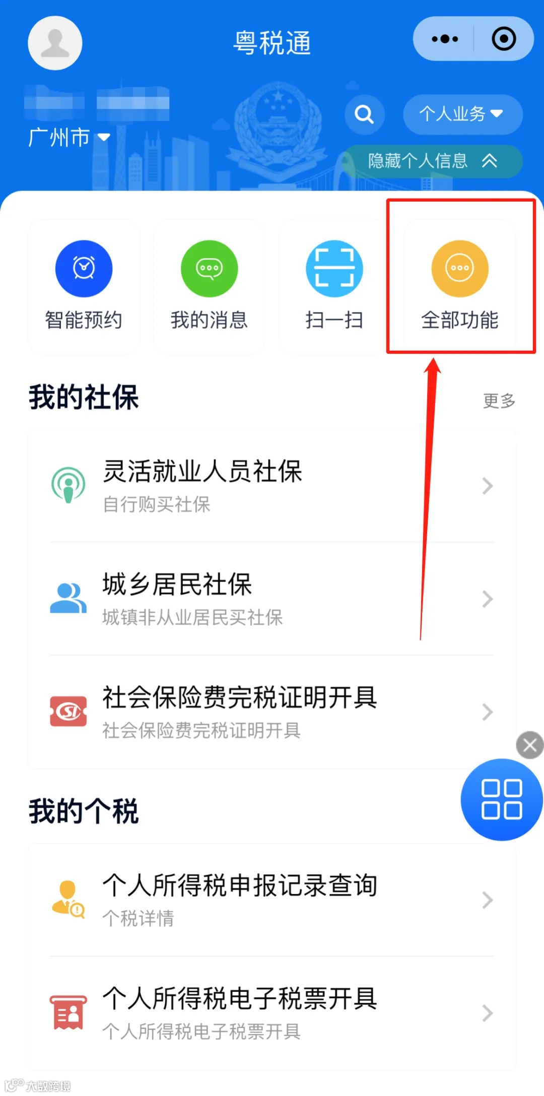 进入口首页点击【全部功能】-【涉税查询】-【社保费查询】