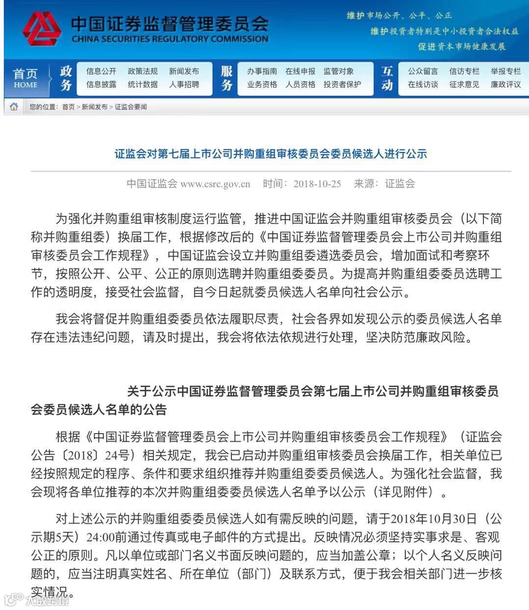 25日,证监会官网对第七届上市公司并购重组审核委员会委员候选人进行公示。