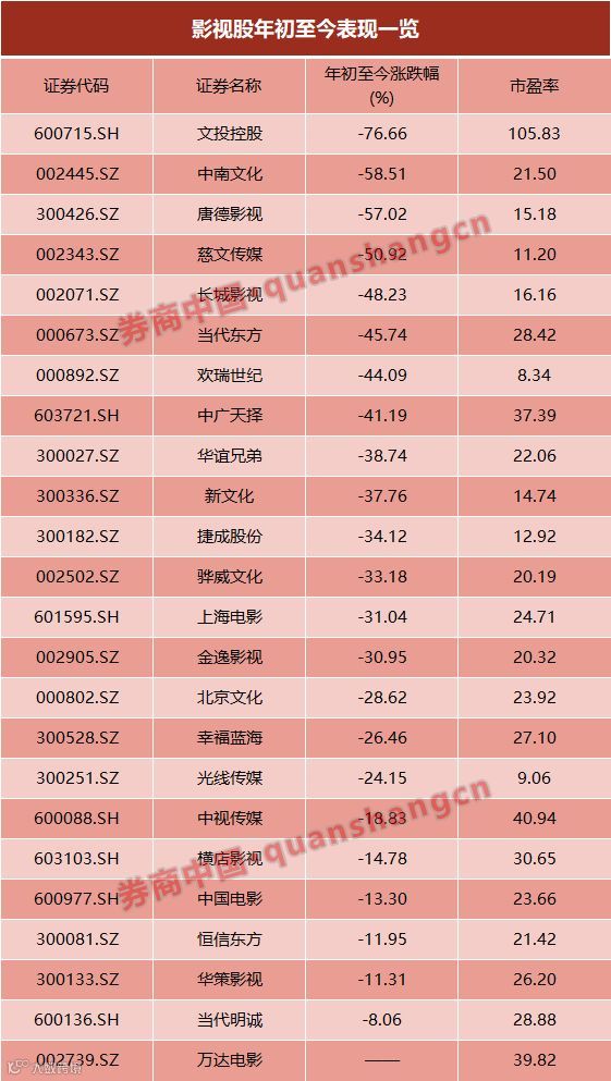 数据显示,除去仍在停牌的万达电影,其余23家影视行业上市公司中,年初至今无一上涨,跌幅最大的是文投控股,跌幅为76.66%。此外,跌幅超过40%的还有7只,分别是中南文化、唐德影视、慈文传媒、长城影视、当代东方、欢瑞世纪、中广天择。