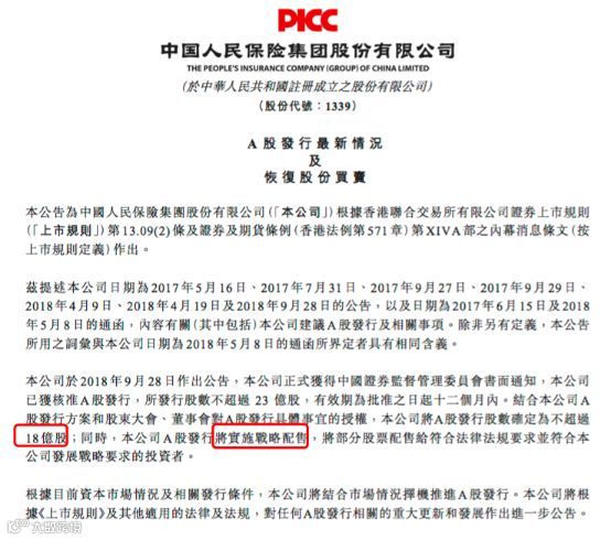 人保最新公告称,将实施战略配售,即将部分股票配售给符合法律法规要求并符合公司发展战略要求的投资者。