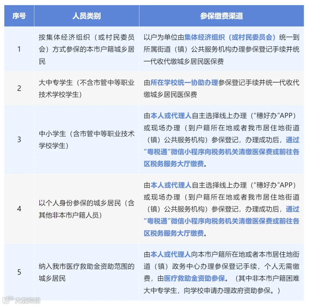 为确保学生顺利参保,医保、教育及税务等部门将于2024年9月至12月期间,通过数据共享完成学籍信息采集与验证。确认无误后将发送税务机关征收医保费,并通过预留电话发送缴费通知。请家长及学生密切关注短信通知,及时完成缴费。同时,家长也可选择前往街道(镇)公共服务机构或使用“粤医保”微信小程序主动确认学生身份。