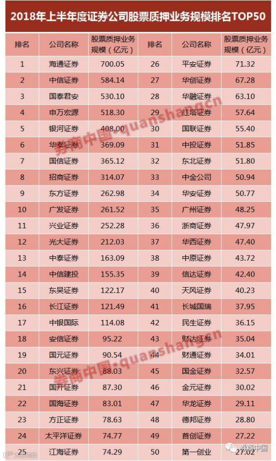 先就质押业务规模来看,参照中国证券业协会公布的《2018年上半年度证券公司经营业绩排名情况》,上半年期间,股票质押业务规模最大的三家券商为海通证券、中信证券和国泰君安,股票质押业务规模分别为700.05亿元、584.14亿元和530.10亿元,这是当前公开信息中最权威的统计数据。