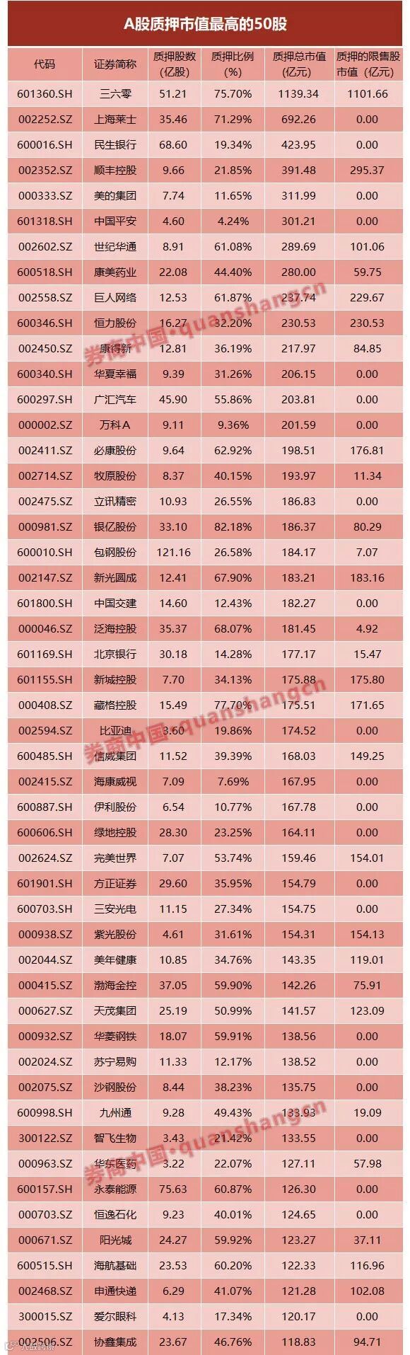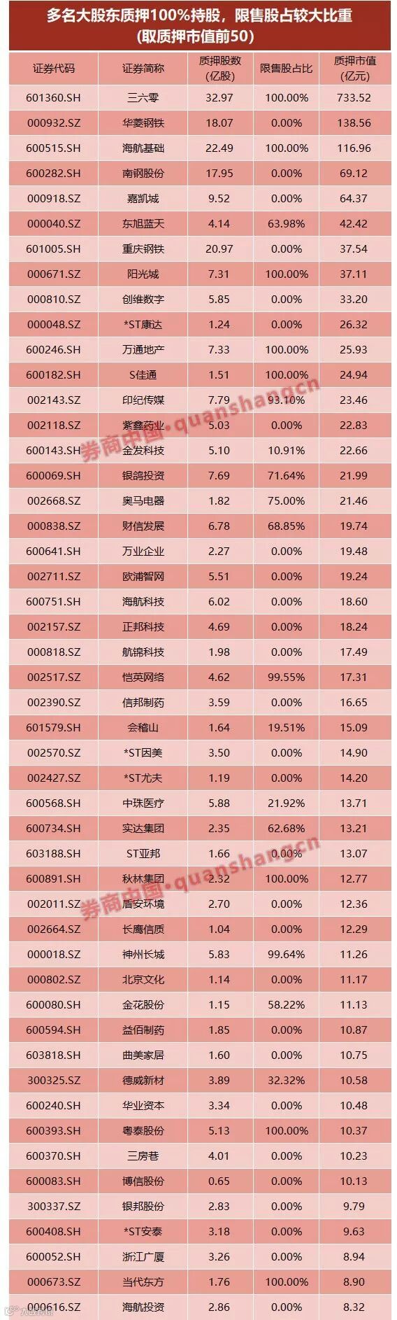 例如,质押市值最大的股东是三六零的奇信志成科技公司,共质押了三六零32.97亿股、占公司总股本的48.74%,以最新收盘价估算,质押市值达到733.52亿元,位居大股东质押第一位。