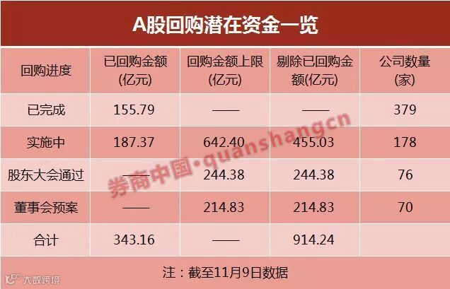 根据回购方案进度不同,我们暂将回购进程分为四个阶段:已实施完成、实施中、股东大会通过和董事会预案。据券商中国记者不完全统计,截至11月9日: