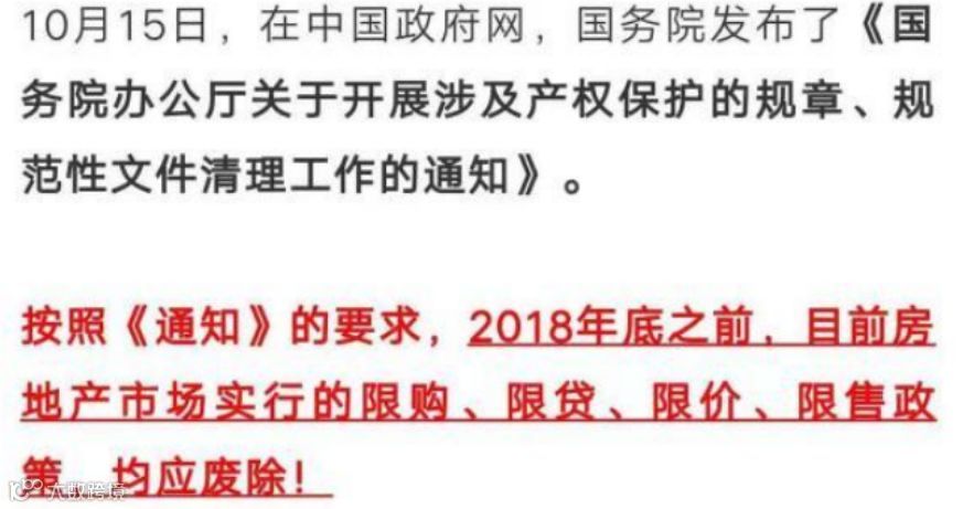 文中显示,按照国务院下发的《通知》要求,2018年底之前,目前房地产市场实行的限购、限贷、限价、限售政策,均应废除。一时间引发市场重点关注。