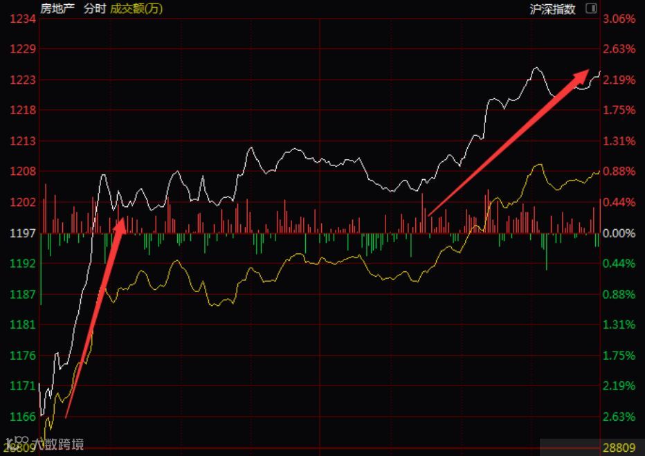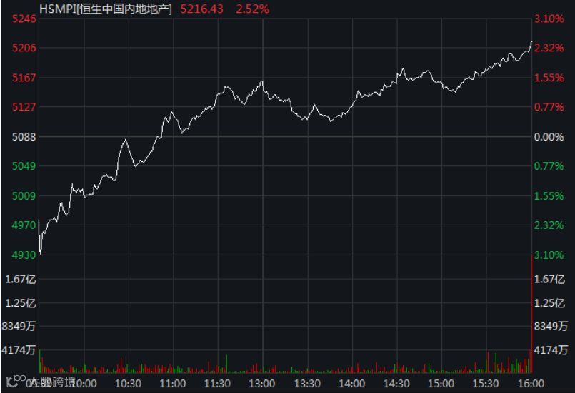 值得注意的是,港股市场中,内房股也出现普涨。即使板块指数在开盘大跌近3%的情况下,也出现大幅拉升,截至收盘,恒生中国内地地产指数收涨2.52%。