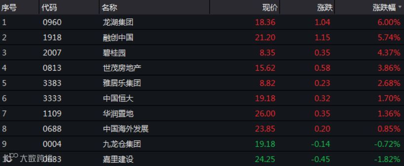 个股方面,龙湖集团涨6%,融创中国涨5.74%,碧桂园涨4.37%,中国恒大盘中一度跌逾4%,最终收涨1.7%。