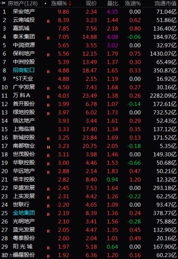 个股方面,荣安地产涨停,云南城投涨逾8%,泰禾集团、嘉凯城幅超过7%,中润资源、保利地产、中州控股涨逾5%,招商蛇口、广宇发展、万科A、涨逾4%。