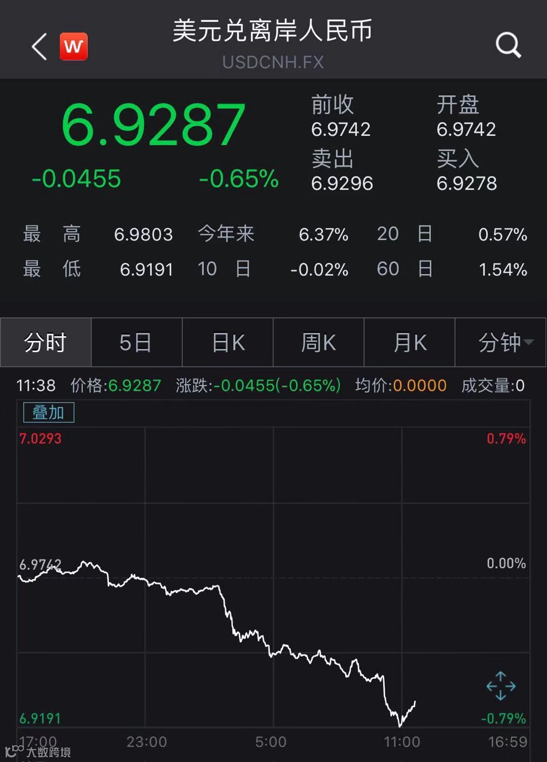 中美关系迎来转机!人民币汇率先行上演惊天大反转!当天,夜盘在岸人民币兑美元(CNY)与离岸人民币兑美元(CNH)汇率极速拉升,截至23:38,CNY达到6.9199 ,上涨约550点;CNH达到6.9289,上涨逾400点。