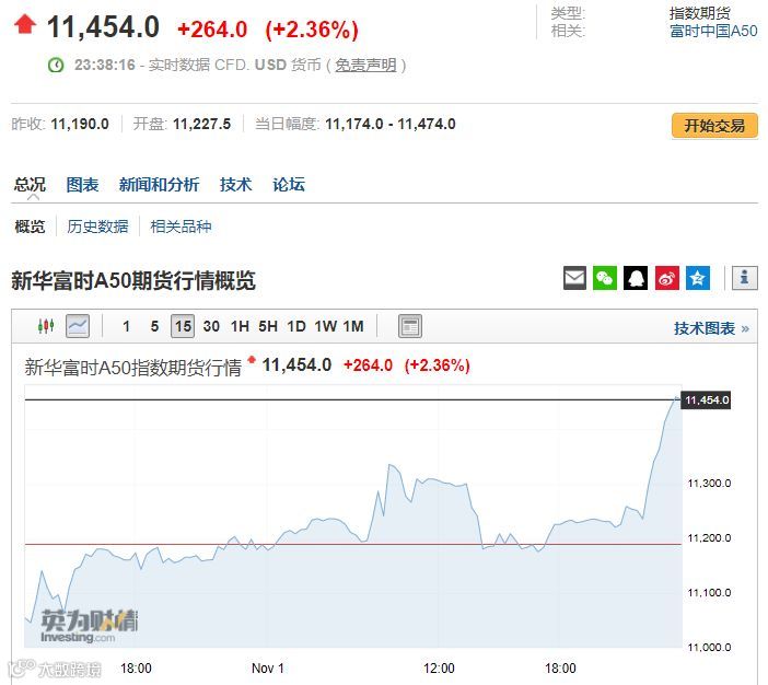 再看新华富时A50期货行情走势,上演直线飙升,截至券商中国记者发稿,上涨264点。