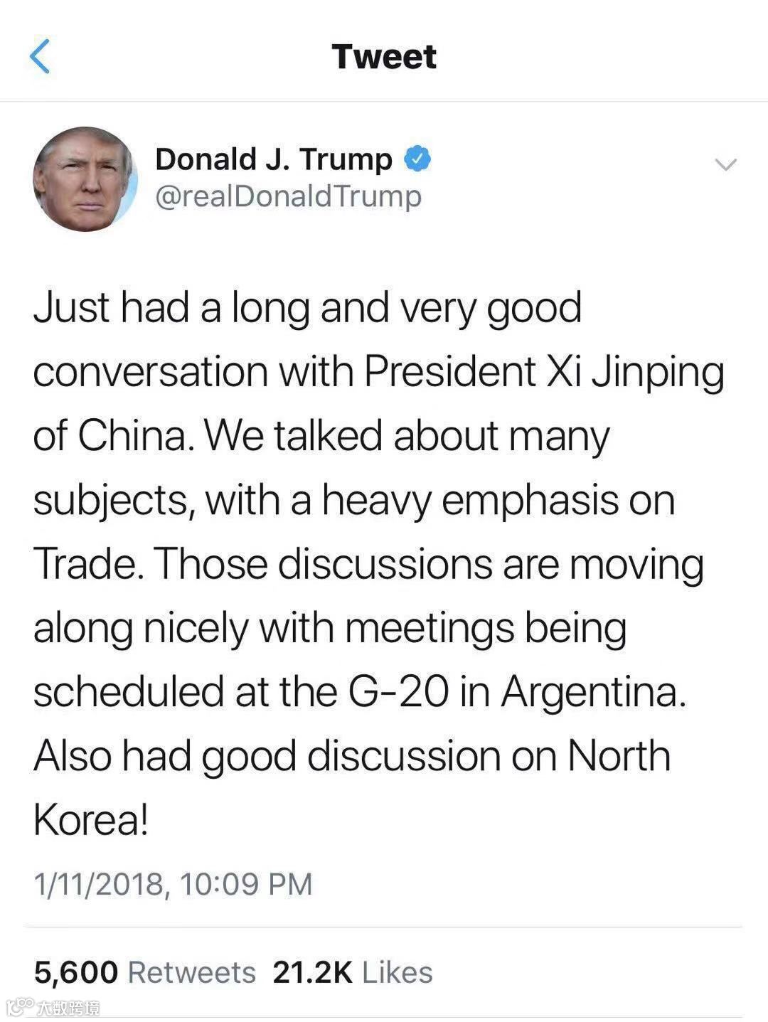 特朗普当天也在其twitter上表示,刚刚与习近平主席进行了非常顺利的对话,讨论了很多内容,重点是中美贸易,之后双方将在阿根廷二十国集团领导人峰会期间继续讨论这些议题。