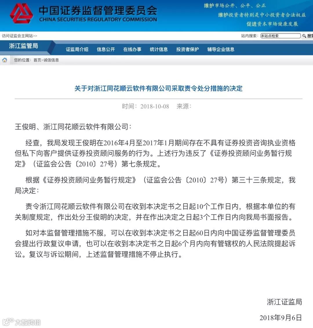 10月8日,浙江省证监局公示了对王俊明及同花顺云软件责令处分的决定。