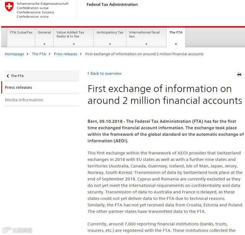 10月5日,瑞士联邦税务局发布公告,按照金融账户涉税信息自动交换(AEOI)标准,该机构已于9月底同其他国家的税务机关交换了金融账户信息,这是史上首次。