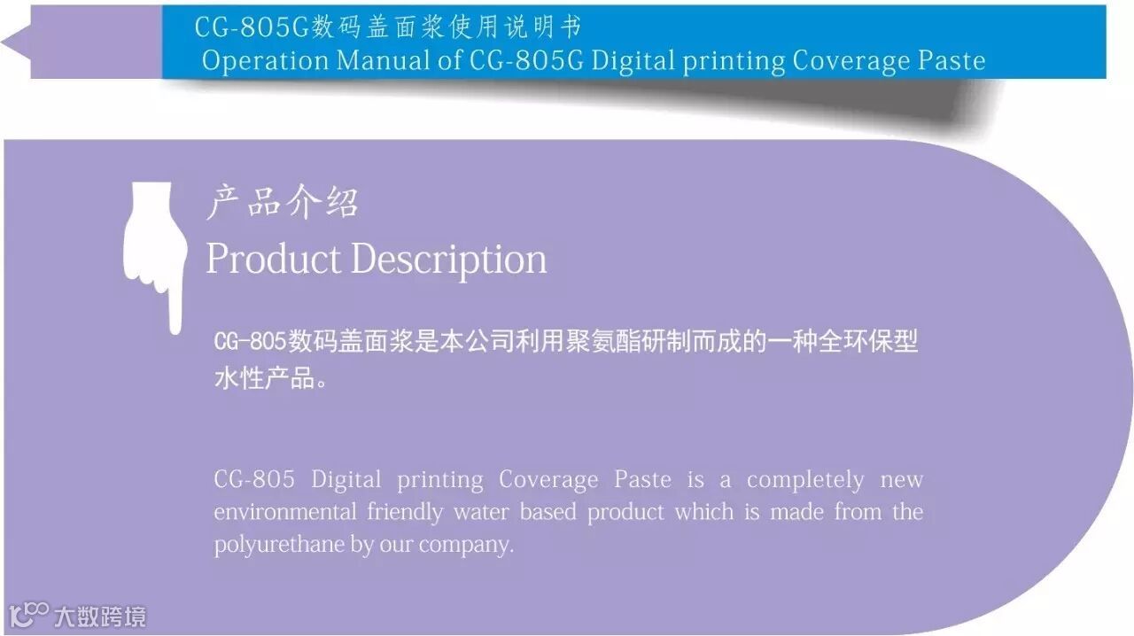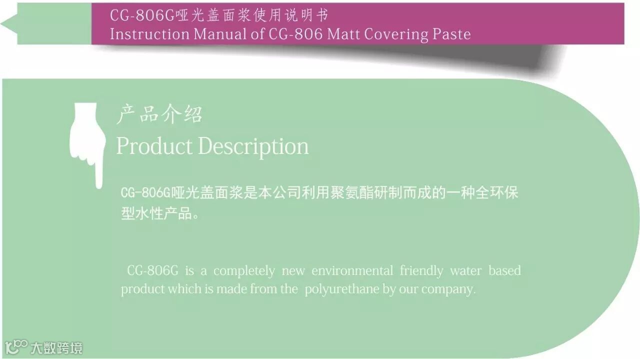 1.CG-806G在盖面使用时一定要加入1%助剂,使用4小时后要更换新胶浆;1% color fixer is required to be added when using the CG-806G, and the mixture must be used up within4 hours.