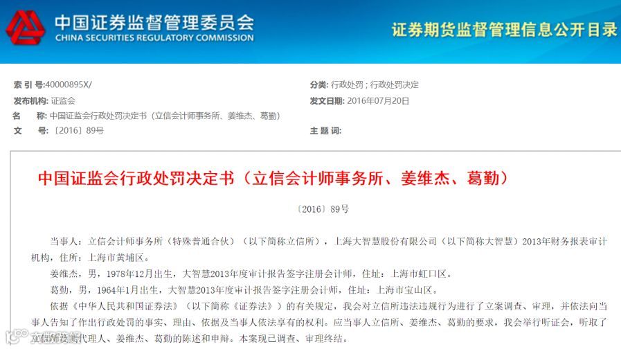 同时,作为大智慧2013年财务报表审计机构——立信会计师事务所(特殊普通合伙)也收到了一份行政处罚。