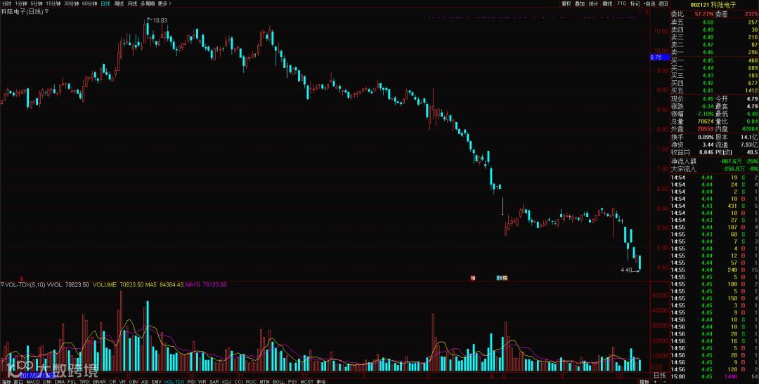 以科陆电子为例,从2017年9月份的股价高点10.83元算起,到今天2018年10月18日已经跌到了最低4.40元,跌幅超过50%,已经腰斩了。