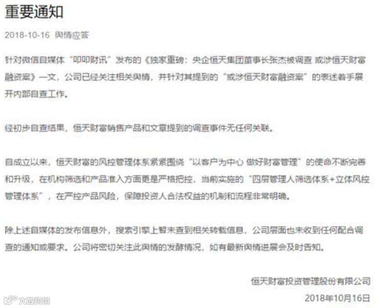 事实上,恒天财富已经回应了多家媒体称,经初步调查结果,恒天财富销售产品和文章提到的调查事件无任何关联。但并未否认上述包括董事长被调查等爆料内容。