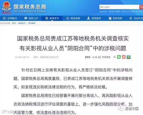 6月3日下午,国家税务总局发布公告称,针对近日网上反映有关影视从业人员签订“阴阳合同”中的涉税问题,国家税务总局高度重视,已责成江苏等地税务机关依法开展调查核实。如发现违反税收法律法规的行为,将严格依法处理。