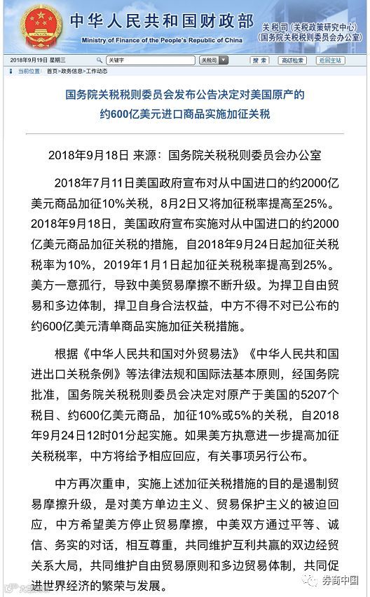 国务院关税税则委员会办公室表示,美方一意孤行,导致中美贸易摩擦不断升级。为捍卫自由贸易和多边体制,捍卫自身合法权益,经国务院批准,决定对原产于美国的5207个税目、约600亿美元商品,加征10%或5%的关税,自2018年9月24日12时01分起实施。如果美方执意进一步提高加征关税税率,中方将给予相应回应。