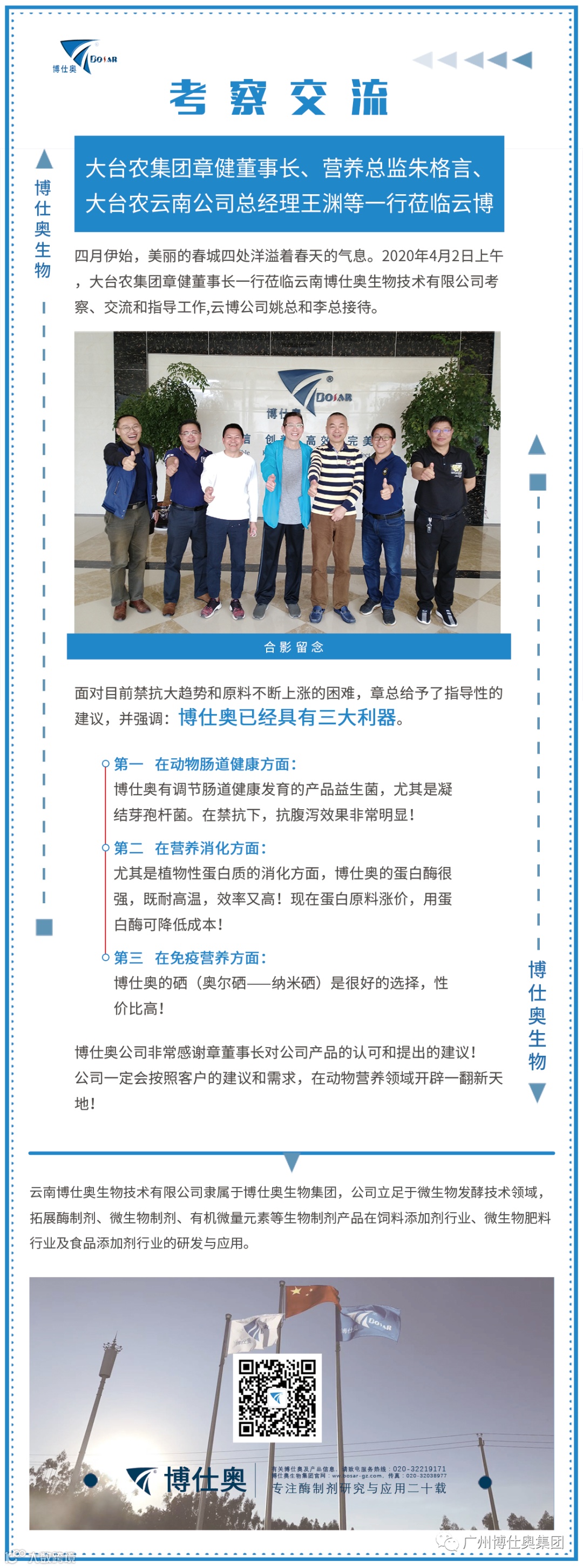 导读:2020年4月2日上午,大台农集团章健董事长一行莅临云南博仕奥生物技术有限公司考察、交流和指导工作。
