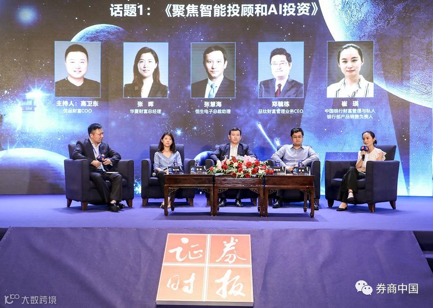 在第一场圆桌论坛中,四位嘉宾聚焦智能投顾和AI投资展开讨论,嘉宾分别为华夏财富总经理张晖、恒生电子总裁助理张慧海、品钛财富管理业务CEO郑毓栋、中国银行财富管理与私人银行部产品营销负责人崔瑛,以及优品财富COO高卫东,此外,优品财富COO高卫东担任论坛主持人。