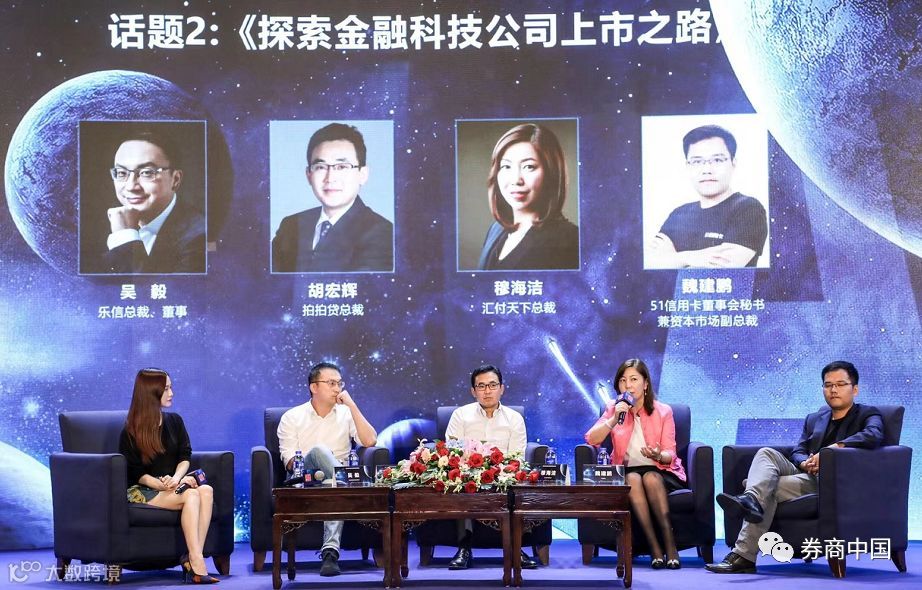 圆桌论坛二的主题为“探索金融科技公司上市之路”,乐信总裁吴毅、拍拍贷总裁胡宏辉、汇付天下总裁穆海洁及51信用卡董事会秘书兼资本市场副总裁魏建鹏等嘉宾分享了自己的实践情况。