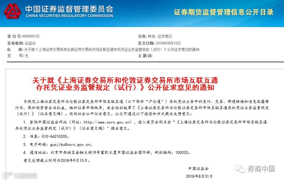 今日证监会就沪伦通的监管细则征求意见,旨在规范沪伦通存托凭证业务涉及的发行上市、交易、信息披露、跨境转换等行为,随着征求意见的落地,沪伦通正式进入实质性推进阶段,后期上交所和中国结算还将陆续发布操作细则和技术准备等相关情况。随着沪伦通制度框架的搭建完成,年底前推出沪伦通可期。