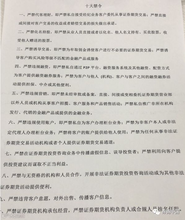 记者获得的一份证券公司客户经理“十大禁令”中,明确提出十条客户经理展业“红线”。南方一中型券商的营业部员工告诉记者,这十条禁令同时适用营业部员工和证券经纪人。