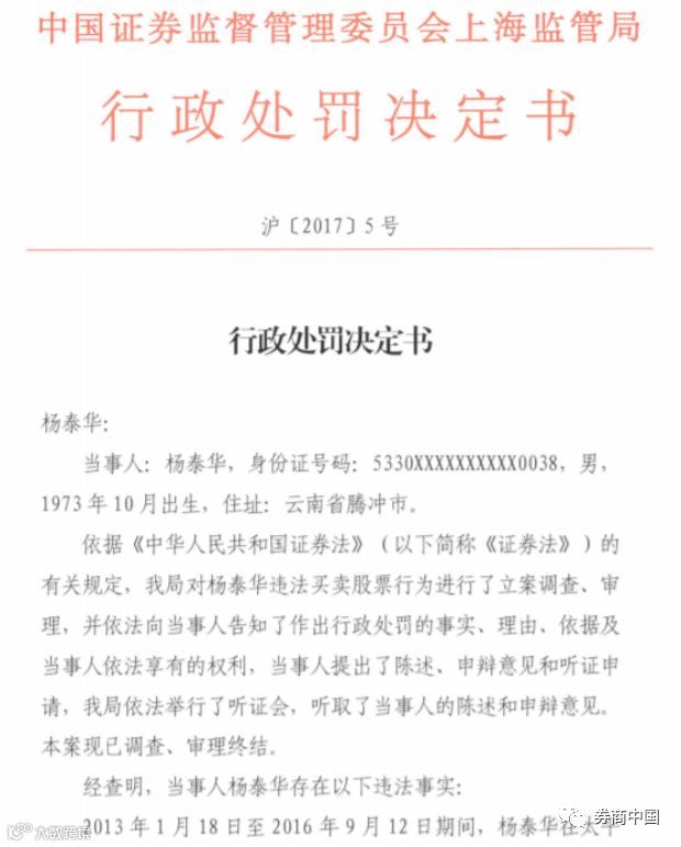 事情要从去年说起,2017年12月13日,上海证监局下发行政处罚决定书,罚没太平洋证券腾冲光华东路证券营业部总经理杨泰华违规炒股已获违法所得14,339,619.13元,并被罚款43,018,857.39元。