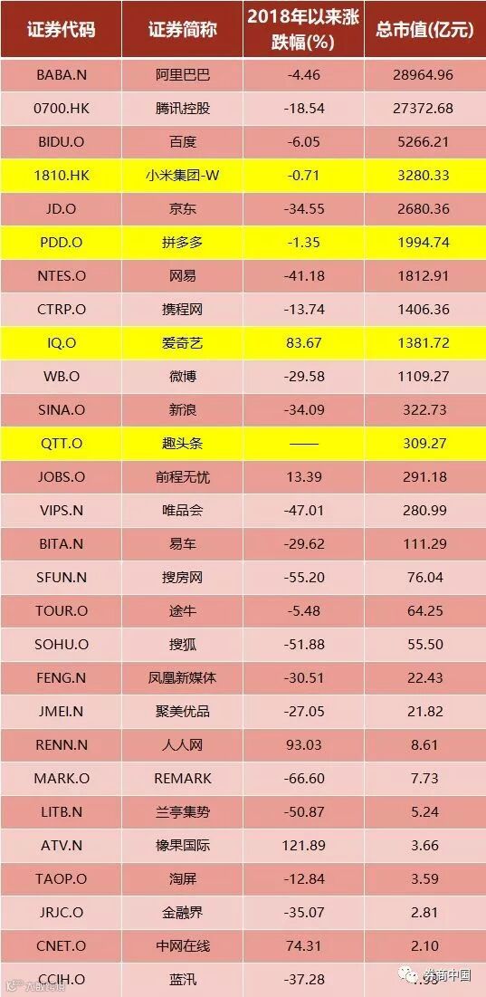京东、阿里、百度、微博、新浪、迅雷、搜狐、唯品会、趣店、宜人贷等中概股全部下挫,部分年内跌幅超过50%。京东年内市值蒸发上千亿,去年与亚马逊并驾齐驱的阿里风光不再,如今阿里市值已被亚马逊甩开一大段距离。