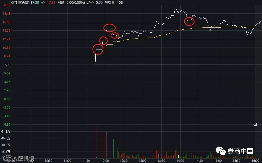 重新打开交易后,趣头条涨幅扩大至128%,随后收窄至95.43%,在13.68美元处第四次暂停交易;
