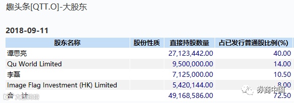 IPO前,趣头条董事长谭思亮持股为40%,为最大股东;Qu World Limited持股为14%,为第二大股东;趣头条CEO李磊持股为10.5%,为公司第三大股东;腾讯旗下Image Flag Investment (HK) Limited持股为8%,为第四大股东。