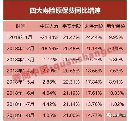 今年1-8月,国寿股份、平安寿险、太保寿险、新华保险原保费收入分别为4190亿元、3295亿元、1607亿元、841亿元,增速分别为4.05%、21%、14.77%、11.57%。这4家险企合计保费9933亿元,同比增长11.56%。继续维持较好的保费增长态势。