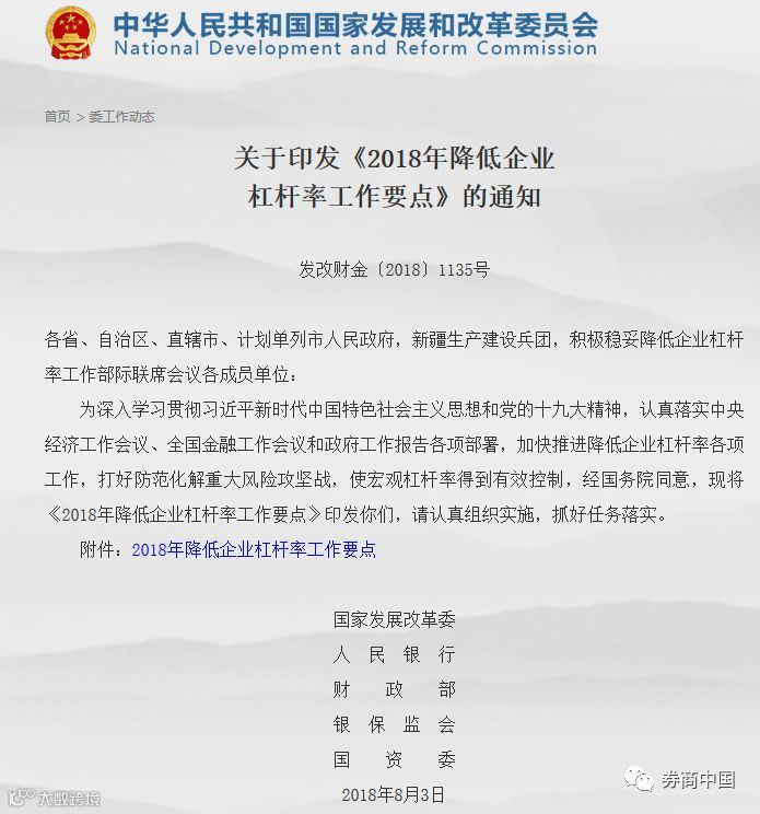 8月8日,发改委、央行、财政部、银保监会、国资委等五部委发布《2018年降低企业杠杆率工作要点》(下称“《要点》”),就如何降低企业杠杆率做出部署,并明确各项部署所对应的部委分工。
