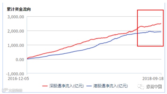 港股通中,深股通即北向资金(红线),也是一路加仓,今年以来净流入975.91亿元,较去年年底大增64.23%。与沪港通的南向资金不同的是,深港通的南向资金一直在加仓,但近几个月明显减缓,远远不如北向资金加仓的坚决。