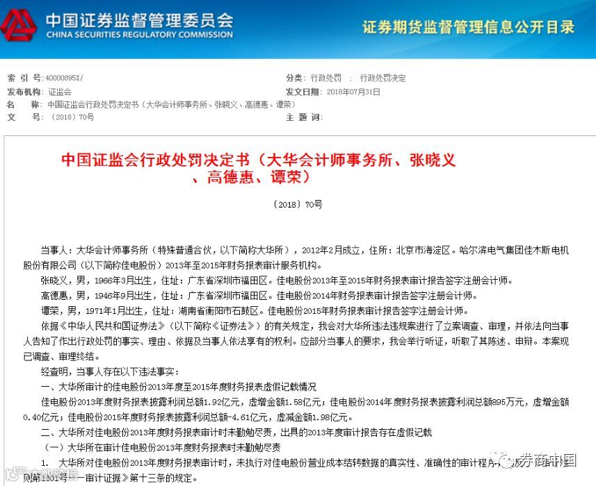 8月3日,证监会官网挂出一份《行政处罚决定书》,指向国内综合排名前十的会计师事务所大华会计师事务所(特殊普通合伙)。因其在2013年至2015年对佳电股份财务报表审计过程中未勤勉尽责,出具的审计报告存在虚假记载,被证监会下达“没一罚三”的处罚决定,合计罚没600万元。