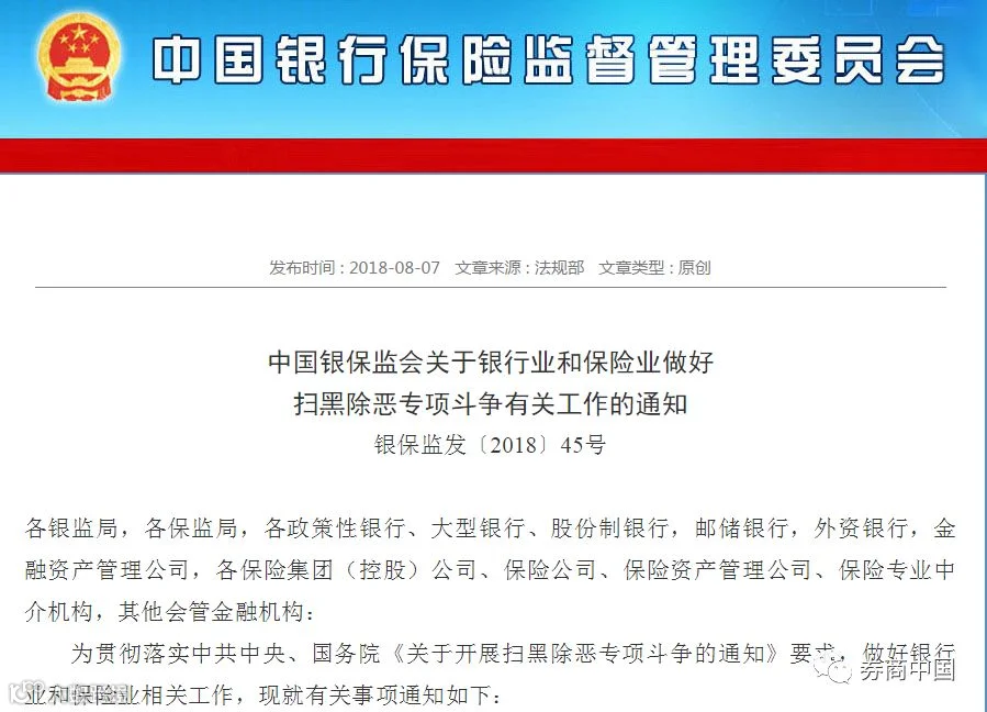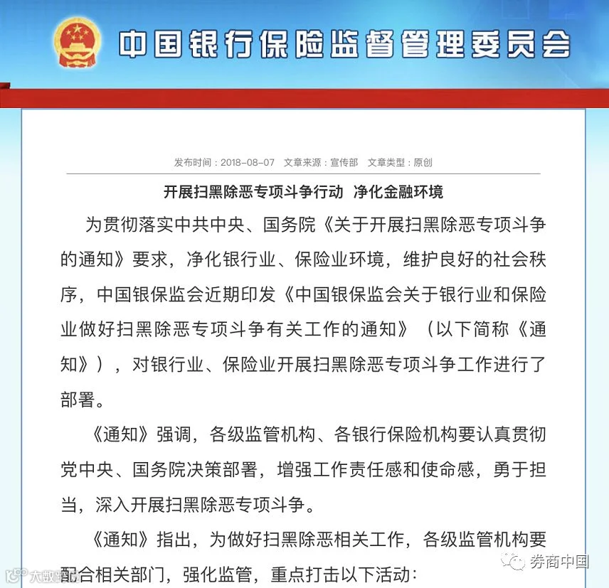 8月7日,银保监会发布公告称,为贯彻落实中共中央、国务院《关于开展扫黑除恶专项斗争的通知》要求,净化银行业、保险业,近期印发《中国银保监会关于银行业和保险业做好扫黑除恶专项斗争有关工作的通知》(以下简称《通知》),对银行业、保险业开展扫黑除恶专项斗争工作进行了部署。