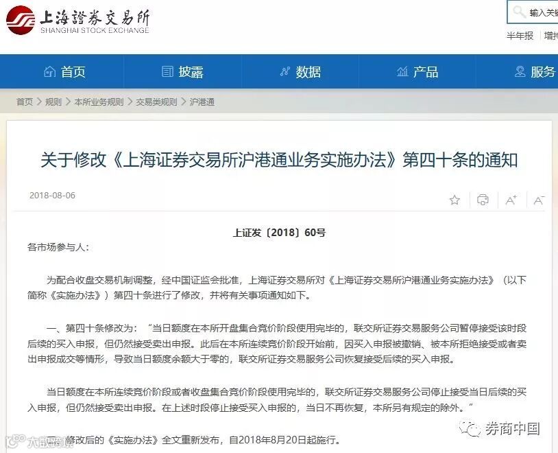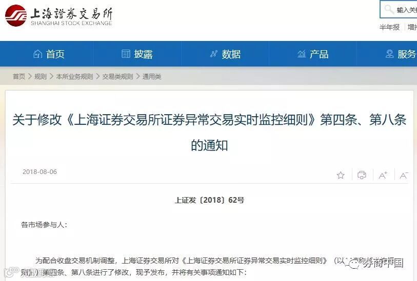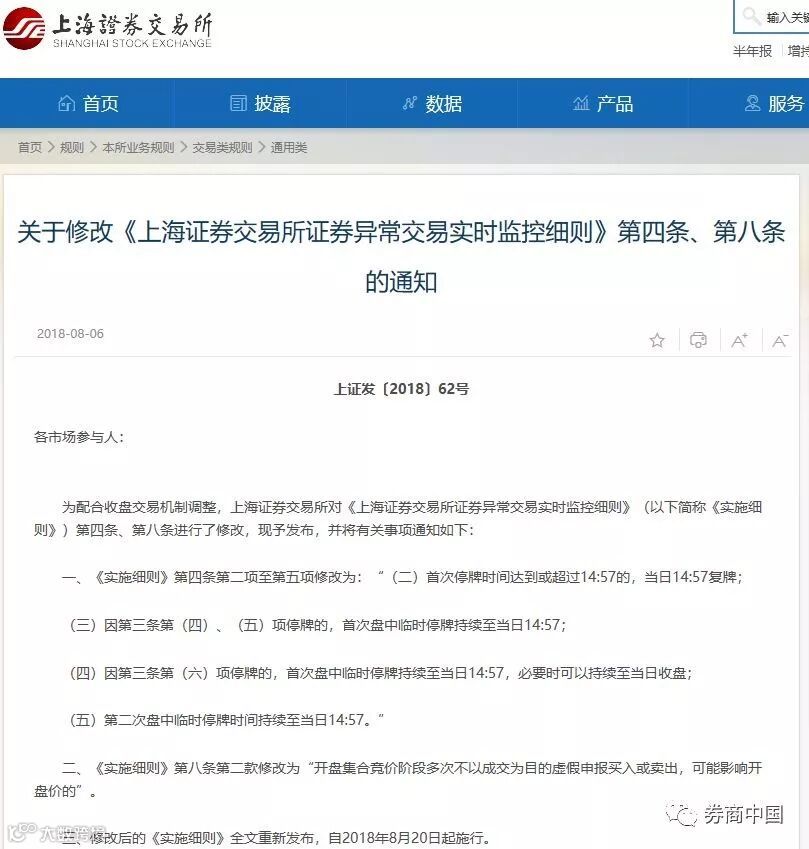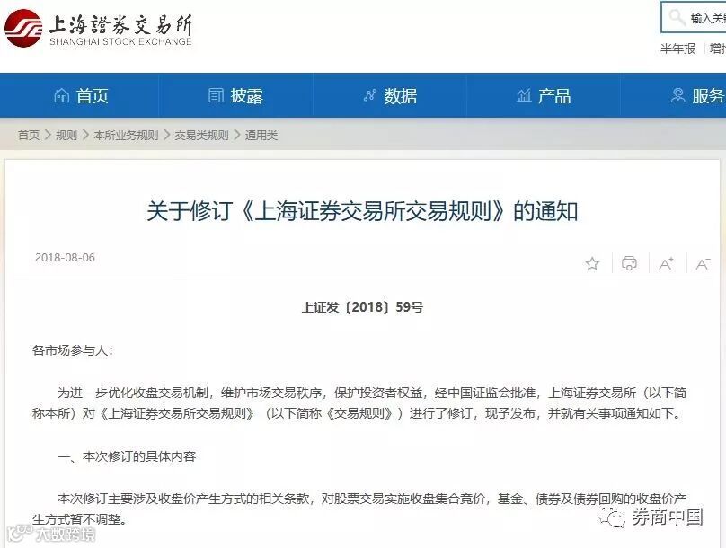 五份通知分别对实行收盘集合竞价、沪股通交易规则修订、调整股票停牌后复牌时间、防控新股炒作、风险警示股票换手率超30%可临停等五项内容进行了修订。上交所强调,收盘交易机制及相关调整将自2018年8月20日起实施。
