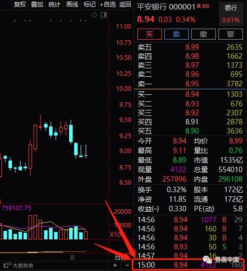 深交所股票——平安银行,14:57过后再无交易,直到15:00收盘,才有一笔交易。