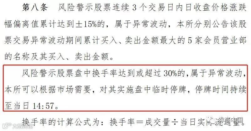 上交所表示,风险警示股票盘中换手率达到或超过30%的,属于异常波动,上交所可以根据市场需要,对其实施盘中临时停牌,停牌时间持续至当日14:57。