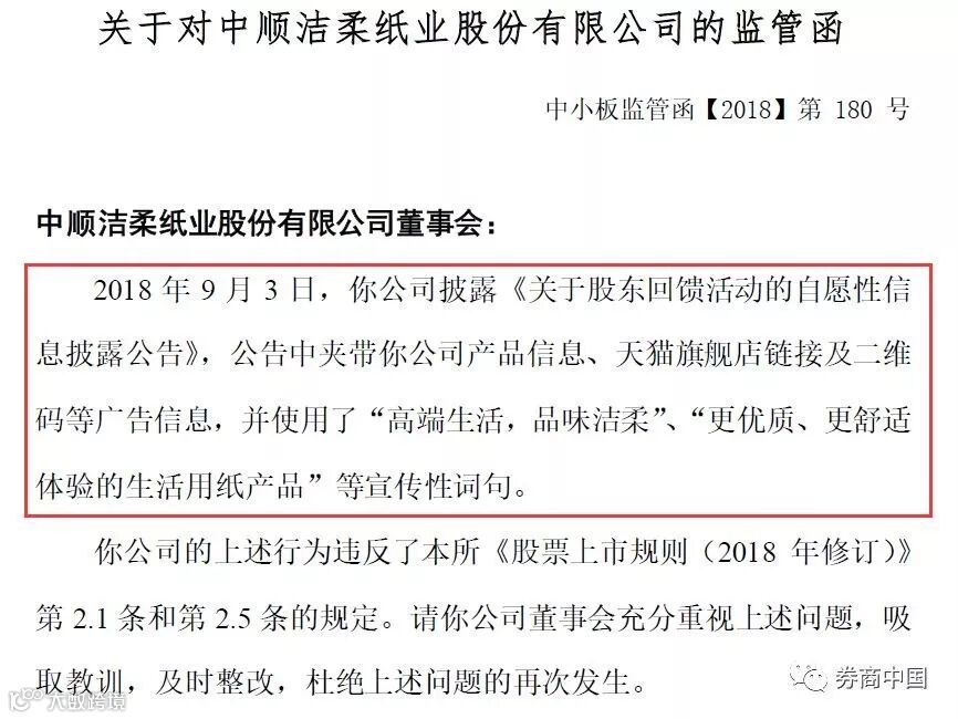 监管函中提到,《关于股东回馈活动的自愿性信息披露公告》中夹带公司产品信息、 天猫旗舰店链接及二维码等广告信息,并使用了“高端生活,品味洁柔”、“ 更优质、更舒适体验的生活用纸产品” 等宣传性词句。